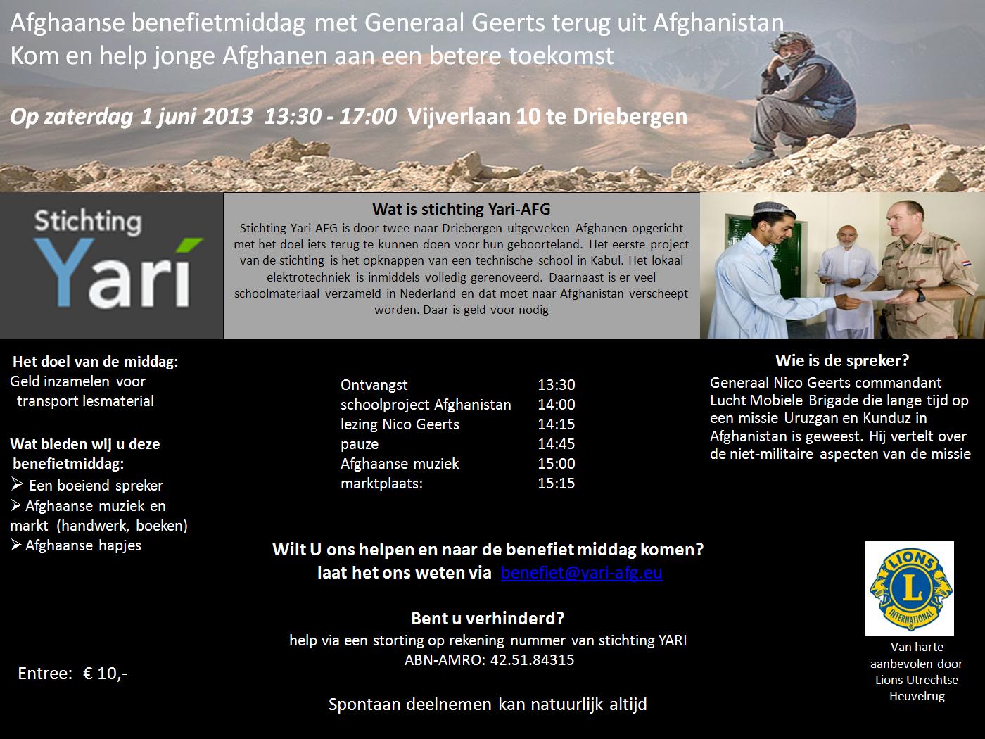 Stichting Yari-AFG organiseert op zaterdag 1 juni 2013 v.a. 13.30 uur, Vijverlaan 10 in Driebergeneen bijeenkomst om de verborgen kant van Afghanistan te laten zien. Een Afghanistan dat vol met enthousiasme en energie vooruit wil. Verhalen die wij normaal niet via media te zien en te horen krijgen worden op deze unieke lezing uitgebreid toegelicht. De rol en de positieve bijdrage van het Nederlandse leger in Afghanistan wordt uit eerste hand toegelicht door generaal Nico Geerts. De middag wordt opgeluisterd met Afghaanse klassieke muziek en een tentoonstelling van het Afghaanse handwerk.